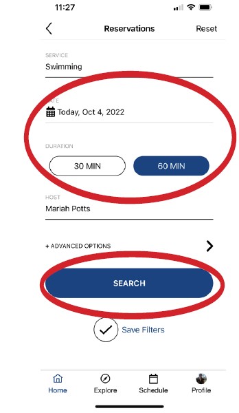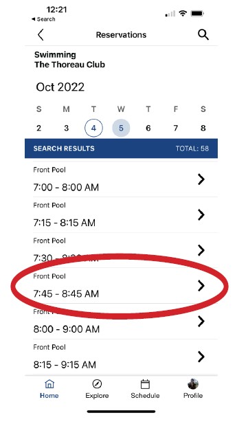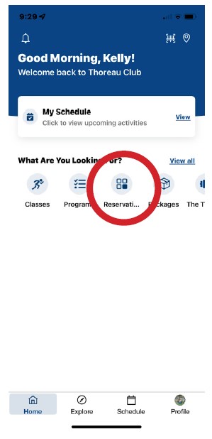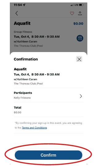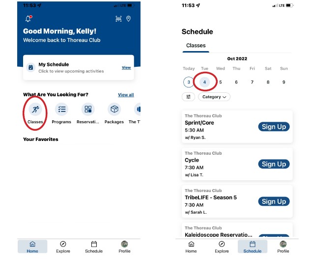 From the app’s landing page, select the Classes tab on the bottom. Select a specific day from the calendar menu up top. The calendar scrolls left to show future weeks. Select a specific drop-in class to expand class details.