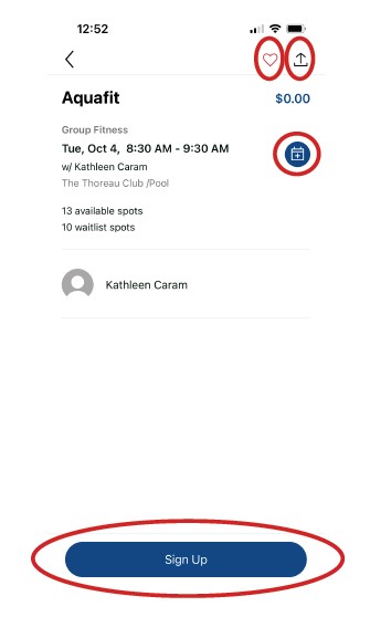 Expanded class details are listed out on the page, including duration, location, specific room placement, cost and instructor. 1. Select the star to add future occurrences of this class to your personal favorites. 2. 3. 4. Add to Calendar will put the class on your phone’s calendar app. Share allows you to share a link to this class via email, text, or other apps.